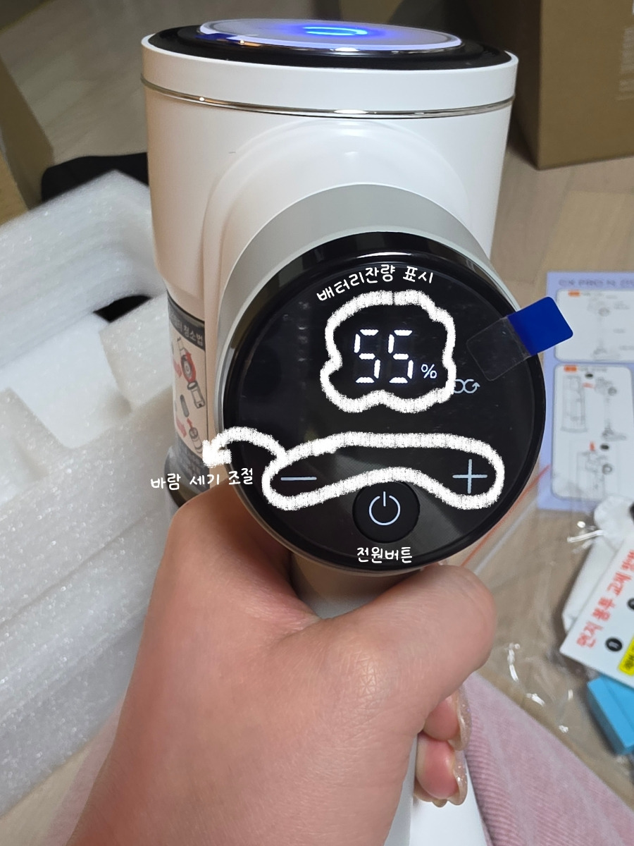 바람세기 조절(3단계), 배터리 잔량이 표시가 됩니다.