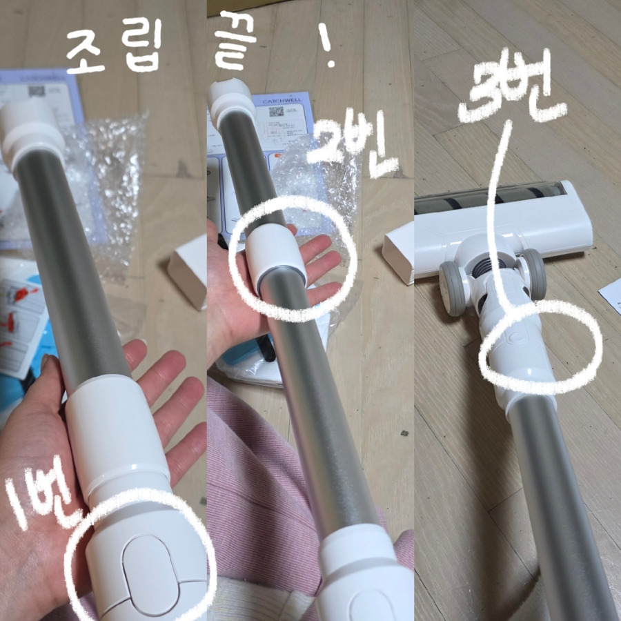 '청소기 조립 잘 할수 있을까?'걱정 했는데 1번하고 3번 결합 하면 끝이더라고요. 2번은 결합이 아니고 길이 조절하는 모습입니다 ^_^