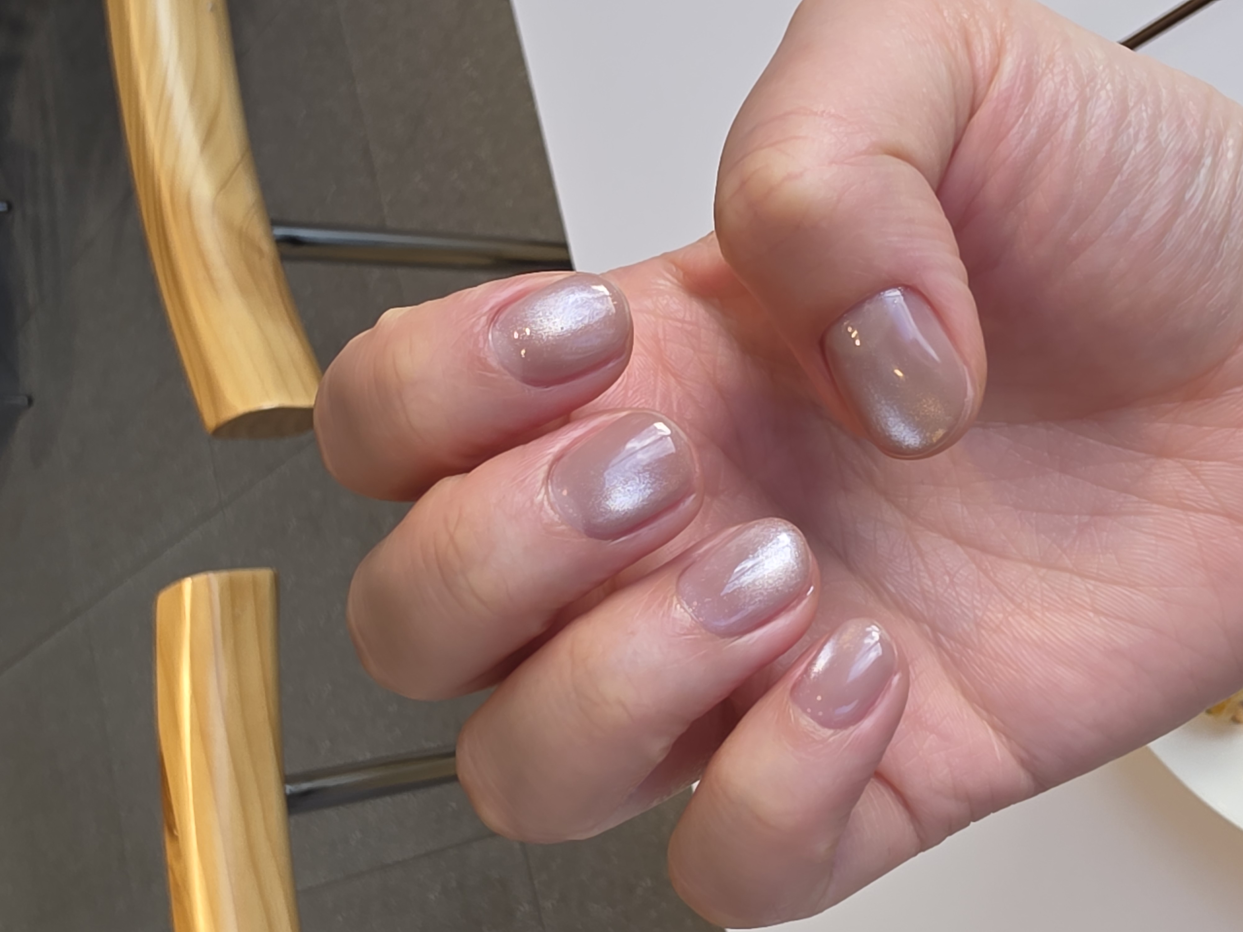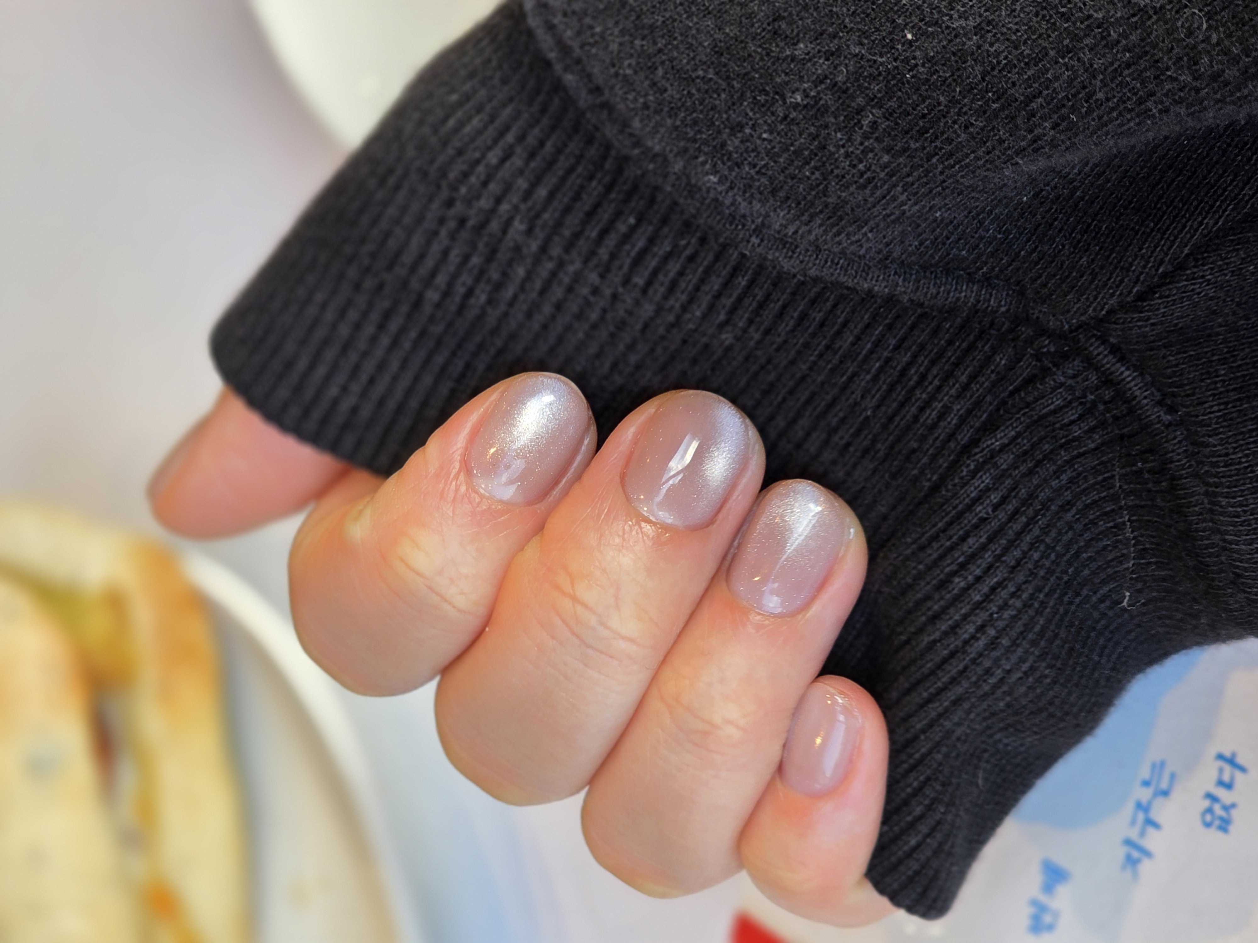 이 네일에 포인트는 자석 네일이다보니 펄 모양을 만들 수 있는데 살짝 물방울 모양으로 동그랗게 모양을 냈습니다. 어느 방향에서 빛이 들어오느냐에 따라 다른 느낌을 낼 수 있습니다.