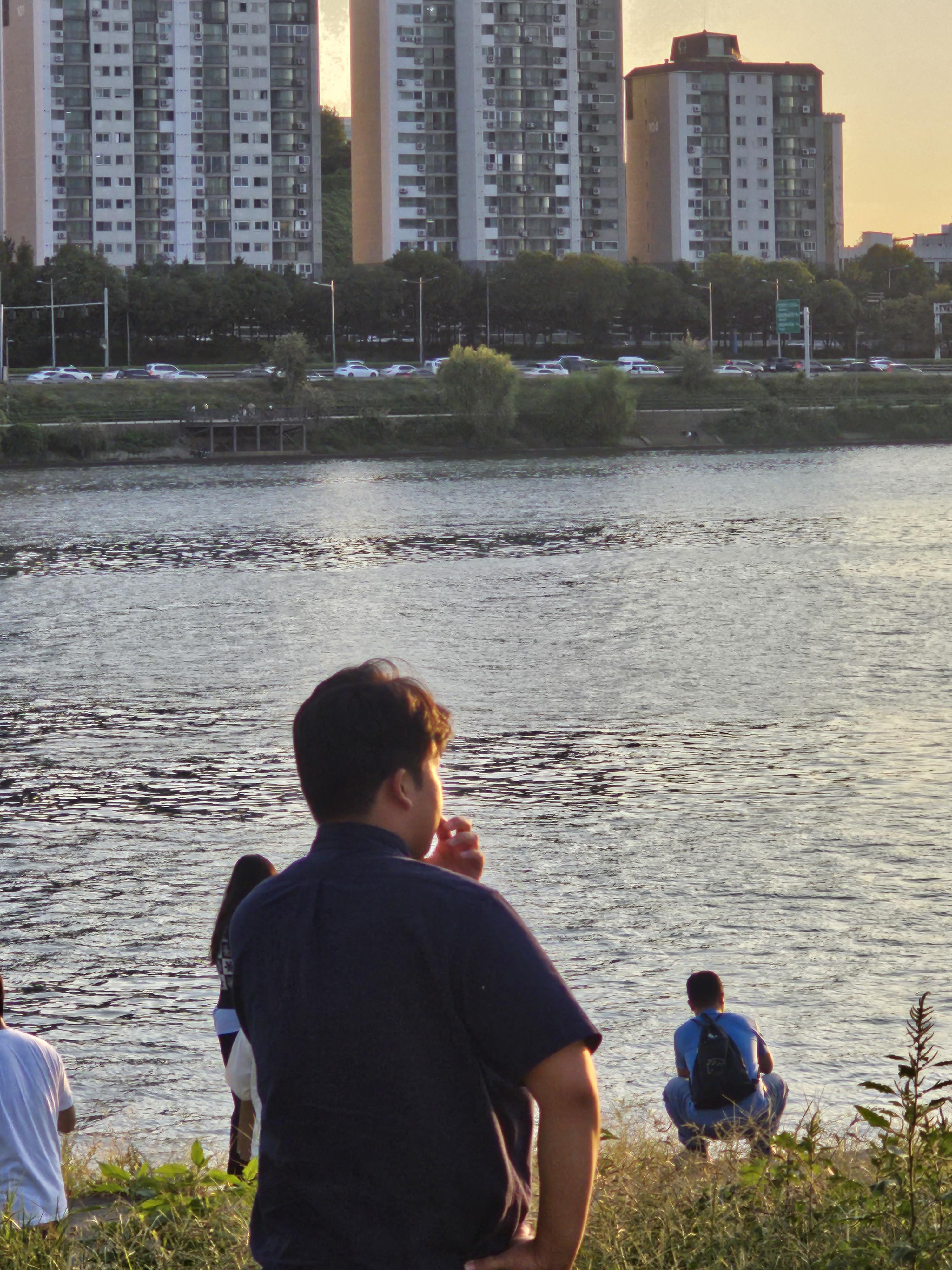 많은 사람들이 강가 앞으로 가서 사진을 찍고